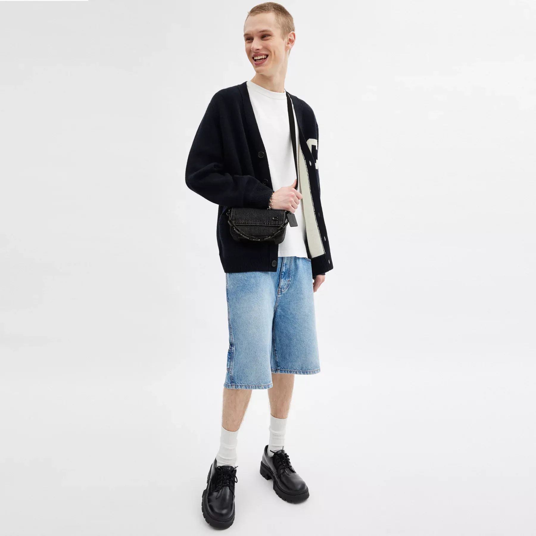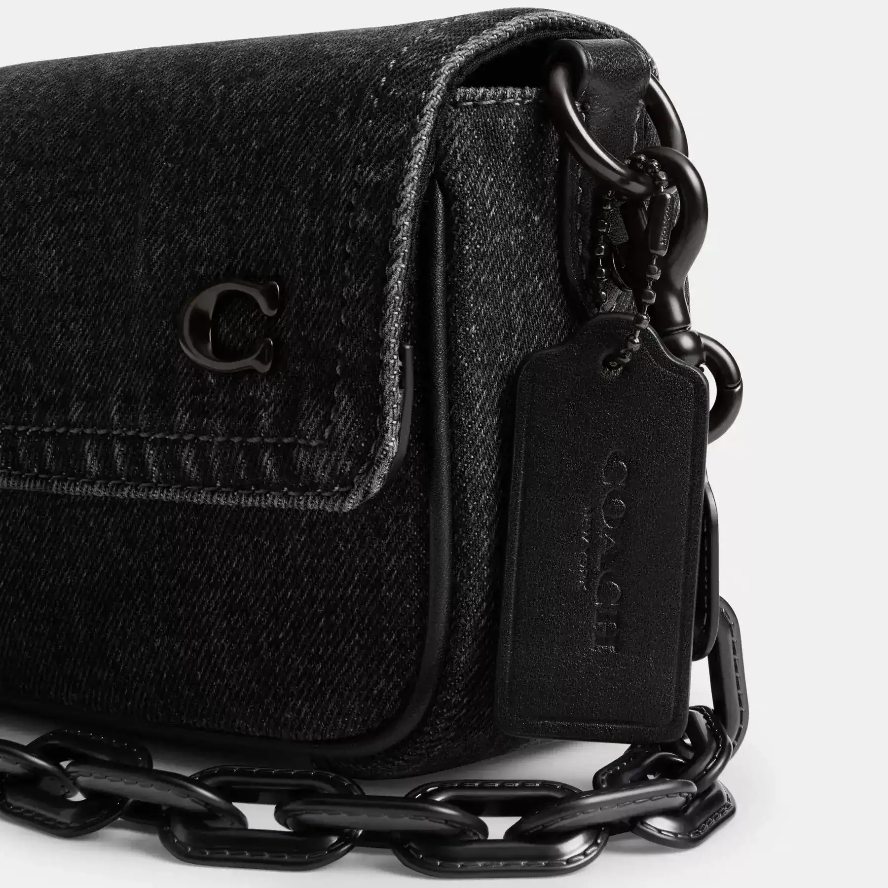 ,For adventures near and far, our Charter is designed to make every journey, commute and errand feel like a first-class experience. Detailed with contrast stitching and our Signature hardware, this rugged denim and refined leather Crossbody 18 is a compact one compartment design with room for a phone and other essentials, an easy flap-front closure and a convenient outside slip pocket. Carry with the striking chunky chain strap or wear crossbody with the detachable strap.