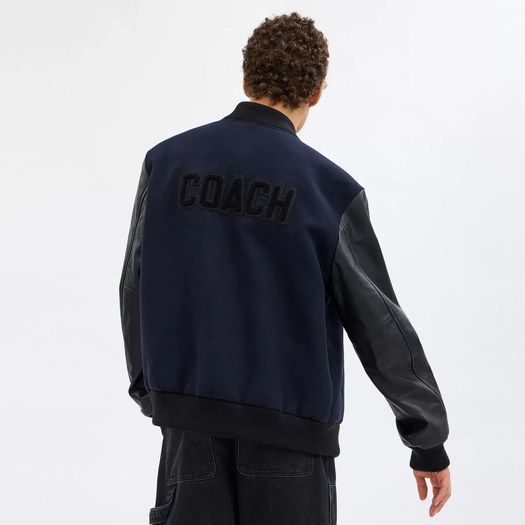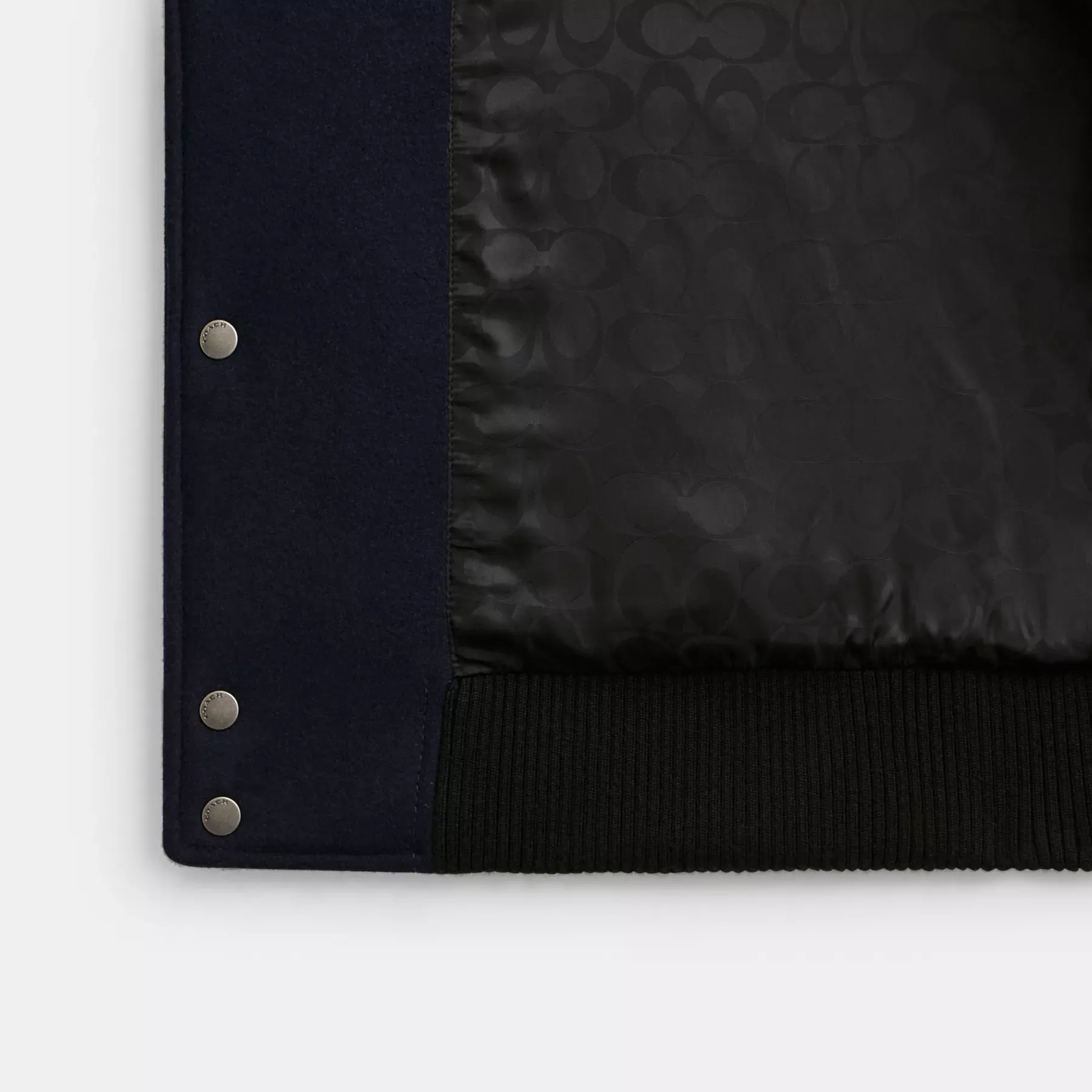 ,A symbol of team spirit and authentic American cool, this vintage-inspired varsity jacket is an iconic Coach silhouette. Crafted in a mix of warm wool and polyester with smooth leather sleeves, it’s finished with welt pockets, ribbed trim, our embroidered name at the chest and our Coach patch at the back.
