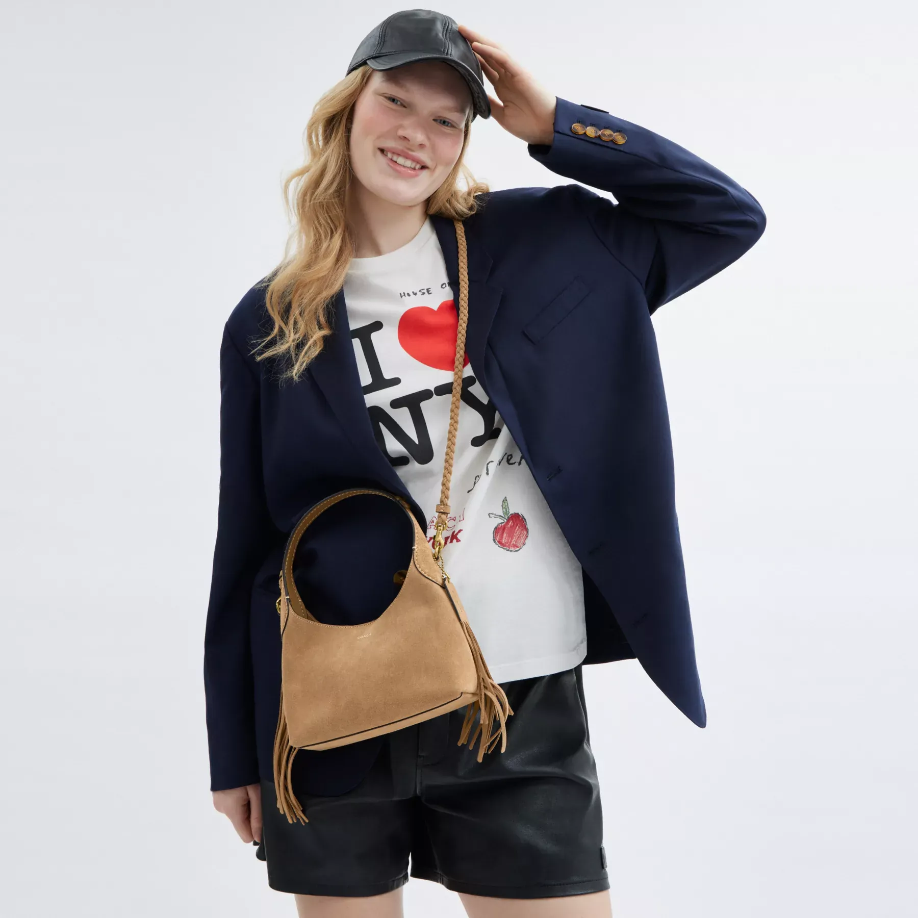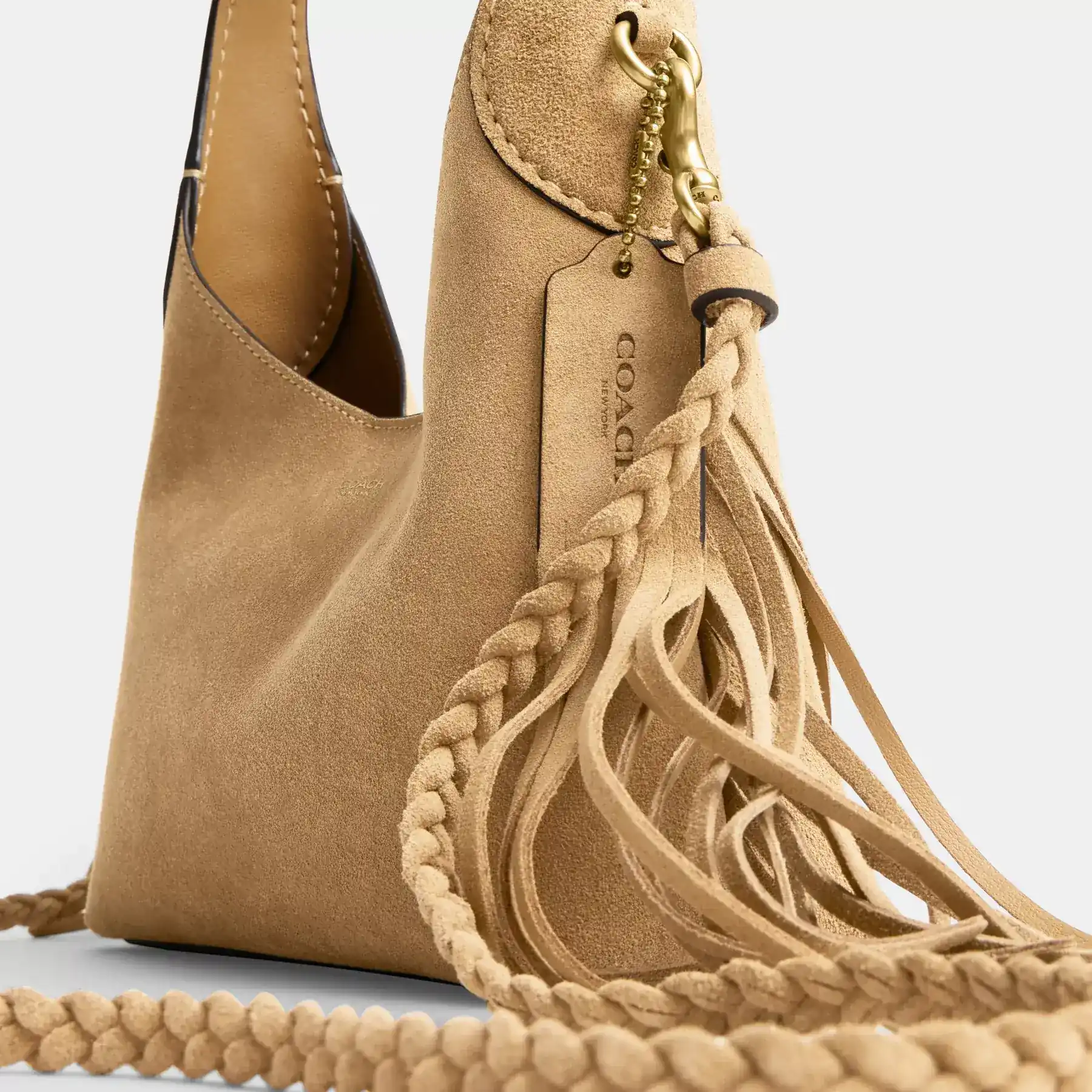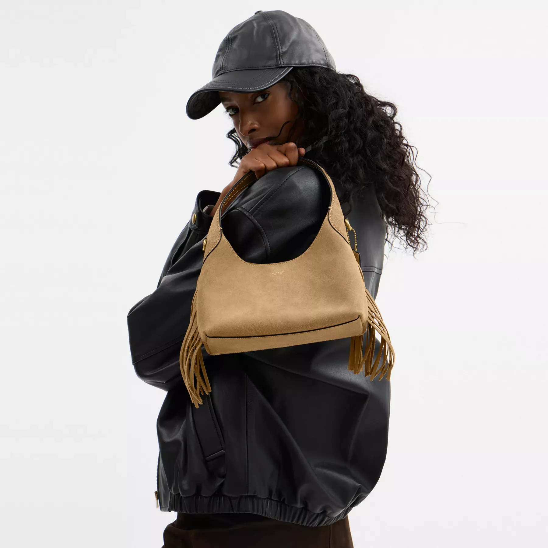 Our Brooklyn is an elegant, minimalist silhouette—with a distinctly New York attitude. A compact design with an easy magnetic closure, the hobo style 23 is crafted of velvety suede and detailed with swingy bohemian-inspired fringe trim. Featuring room for the essentials and a multifunction pocket for organization, carry it by hand or attach the elegant chain strap to wear on the shoulder or crossbody.
