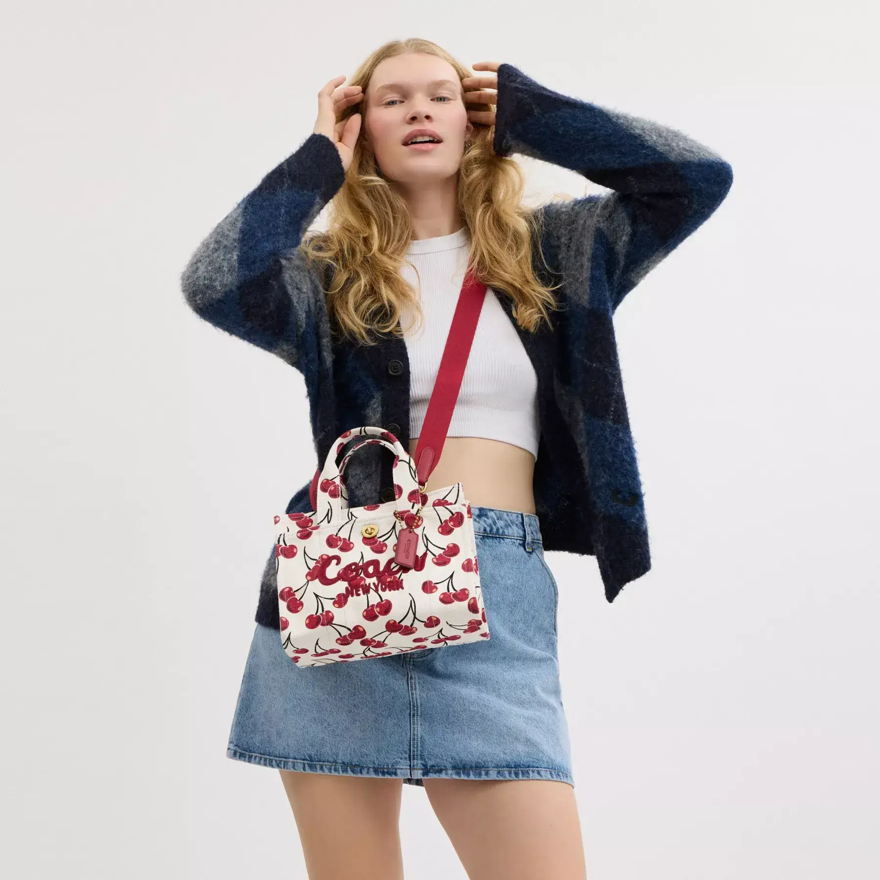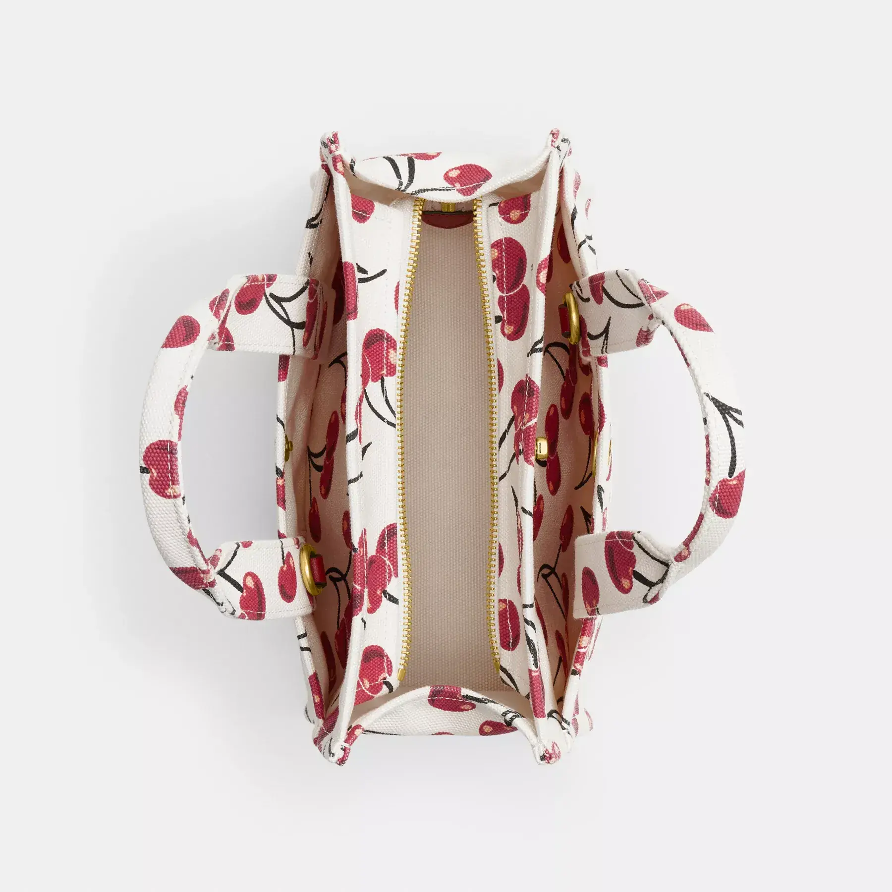 Carry as much (or as little) as you like with our lightweight Cargo tote. Detailed with our cursive Coach script embroidery and iconic turnlock closure, this compact 26 has an open interior with room for an iPad, two outside pockets for easy organization and a removable webbing strap for shoulder or crossbody wear. Printed with a cheerful cherry motif, this versatile canvas style is crafted with 100% cotton* sourced from farms that use regenerative agricultural practices—those that help to maintain and rejuvenate land, increase biological diversity and soil health, and could lead to increased carbon absorption. It’s inspired by our commitment to reducing our impact on the planet. Now no matter where you go with it, you’ll always be toting around a little extra love for the planet.