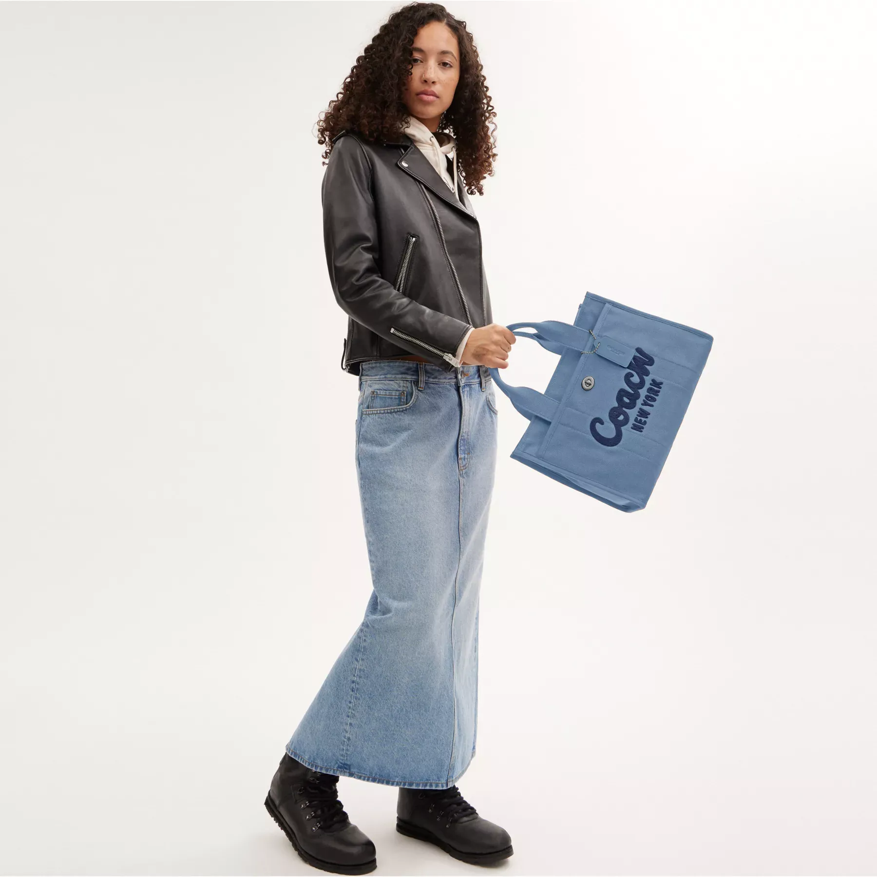 Carry as much (or as little) as you like with our lightweight Cargo tote. Detailed with our cursive Coach script embroidery and iconic turnlock closure, this spacious carryall has an open interior with room for a 13″ laptop, two outside pockets for easy organization and a removable webbing strap for shoulder or crossbody wear. Crafted to last, this versatile style is made with cotton sourced from farms that use regenerative agricultural practices* and inspired by our commitment to reducing our impact on the planet. Now no matter where you go with it, you’ll always be toting around a little extra love for the planet.