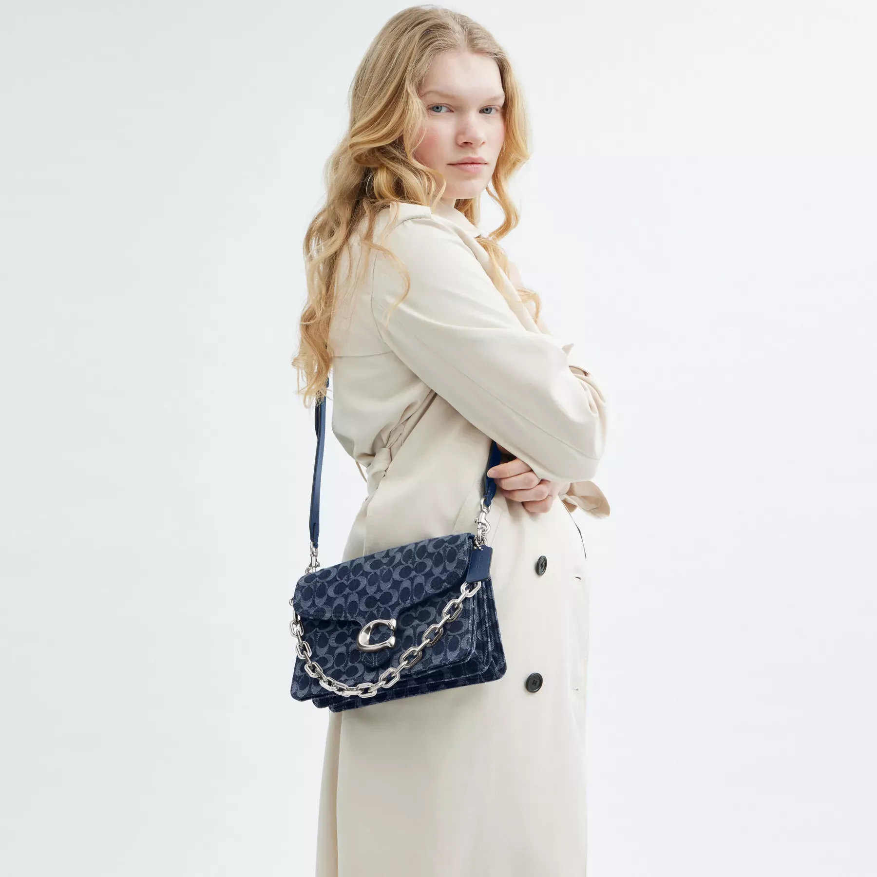 A modern take on an archival 1970s Coach design, our structured Signature denim Chain Tabby shoulder bag is detailed with refined leather trim. Finished with our Signature hardware for an iconic touch, the compact style has space for all the essentials, inside multifunction organizational pockets and a convenient outside zip pocket for easy access items. The versatile design features three detachable straps to carry by hand, wear snug on the shoulder with the elegant stitched chain-link strap and short leather strap or go hands-free with the long leather crossbody strap.