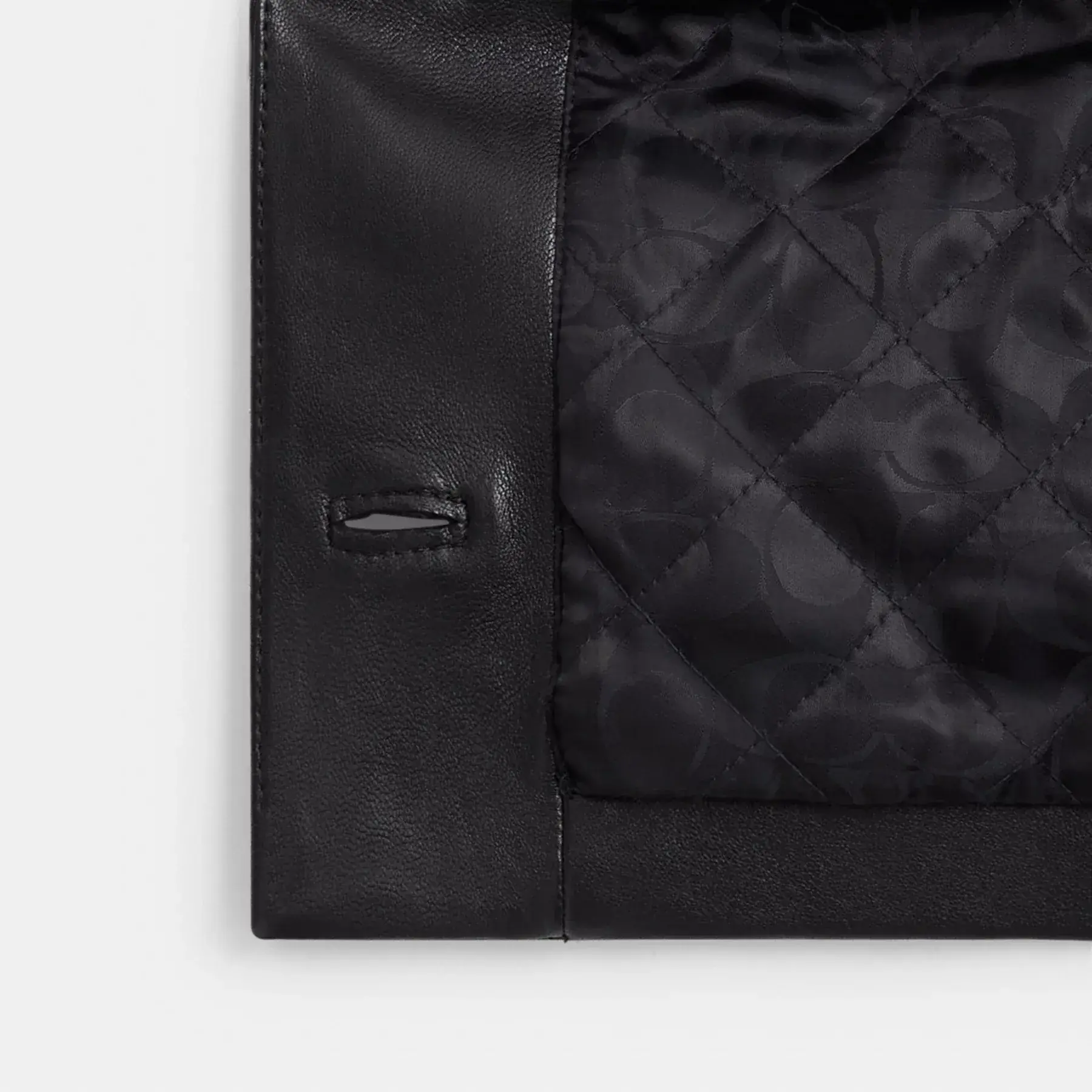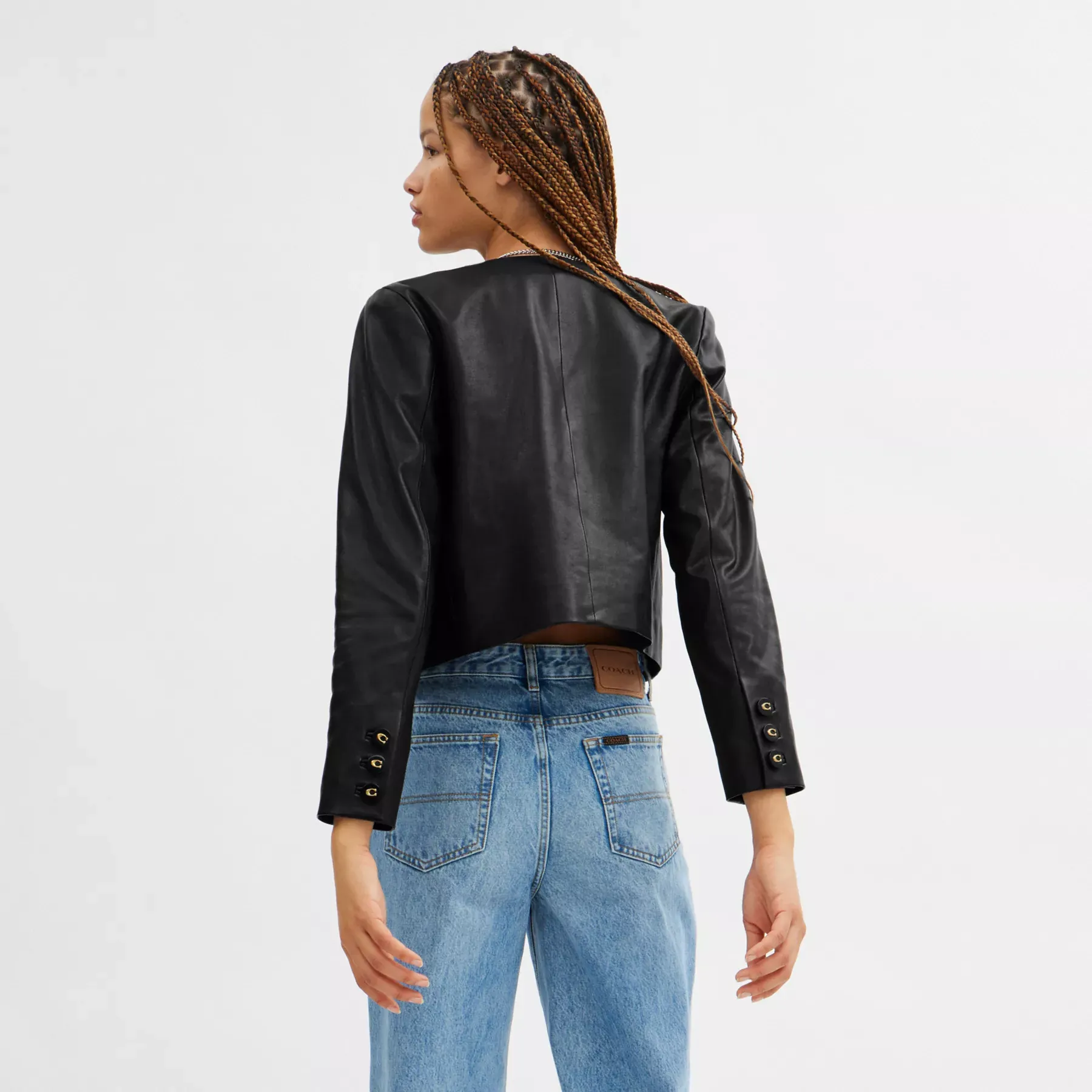 ,A modern take on a classic style, this four-pocket jacket is crafted of buttery soft leather. Detailed with our Signature enamel buttons, the shrunken-fit collarless silhouette is fully lined for ultimate comfort.