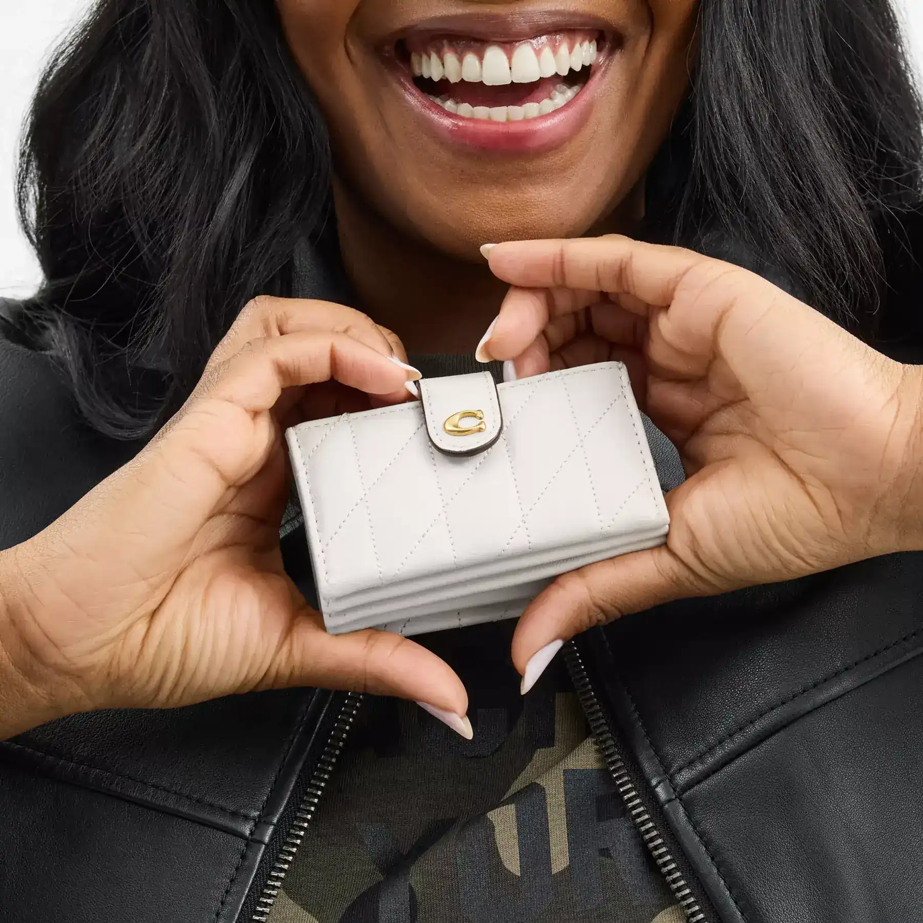 This compact multi card holder is crafted of quilted nappa leather detailed with our Signature hardware. It features five expandable compartments that fold neatly and stay put with the bridge snap closure.