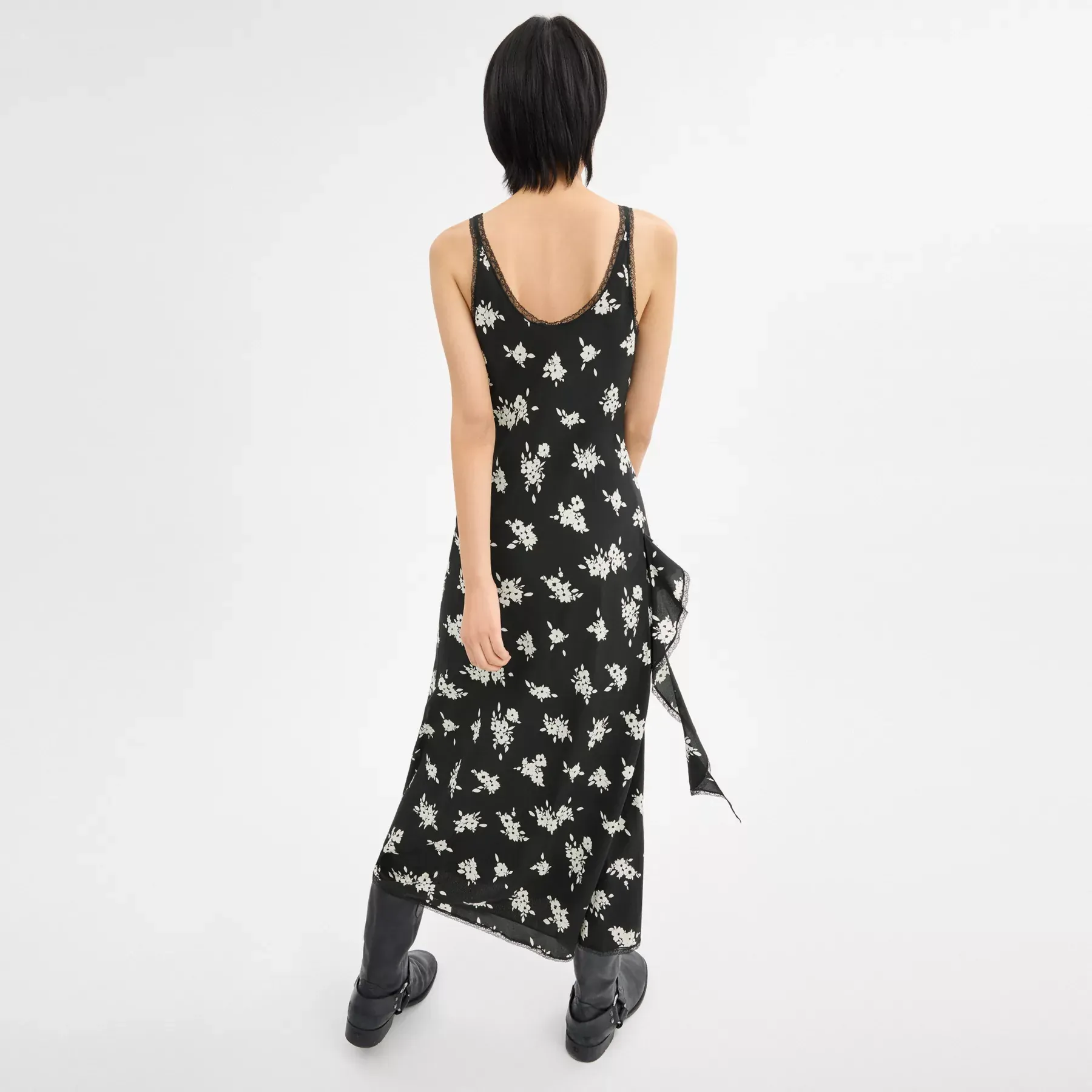 ,Cascading ruffles, lace trim and a dramatic daisy motif add airy romance to this silk maxi dress. Featuring a removable slip, the long silhouette is finished with a sporty scoop neckline.
