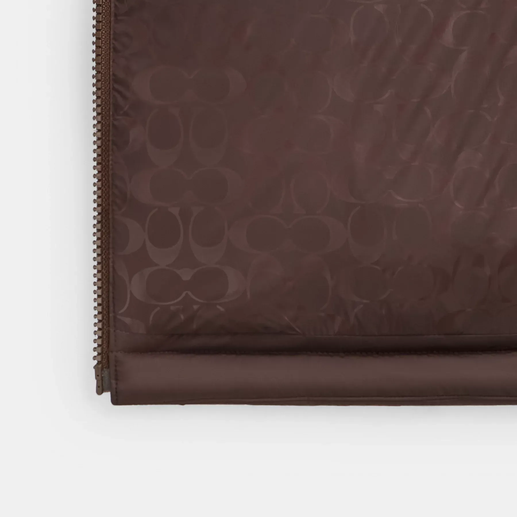 ,Detailed with a tonal Signature yoke for subtle heritage style, this mid-length puffer has a pillowy down fill and a protective funnel collar for extra warmth. Inspired by our commitment to rethinking and reducing our impact on the planet, the zip-front style is crafted of recycled polyester and features removable hood, belted waist, snap pockets and an adjustable bungee tie at the hem.