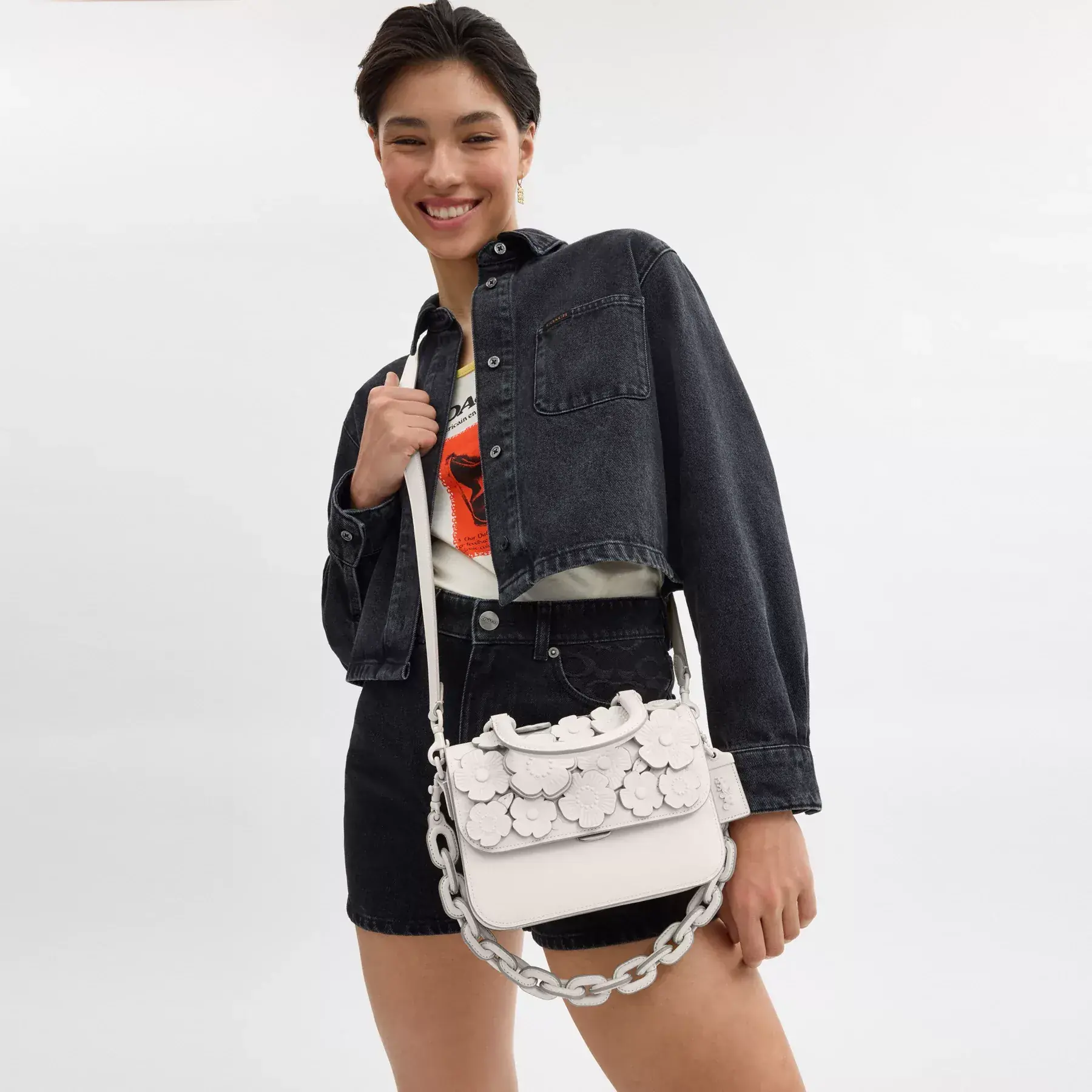 Inspired by free spirits, rebels and dreamers, the aptly named Rogue is a go-anywhere bag. This petite addition to the Rogue family can be carried by the top handle, worn as a short shoulder bag with the elegant leather-covered chain strap or crossbody with the long detachable strap. Perfectly organized with four compartments and a convenient outside slip pocket for easy access to essentials, the versatile glovetanned leather style secures with a pushlock closure and finished with durable tonal matte PVD coated hardware. It’s embellished with our debossed Tea Rose motif and an abundance of our hand-applied dimensional Tea Rose appliqué in a process that take up to 3 hours to create.