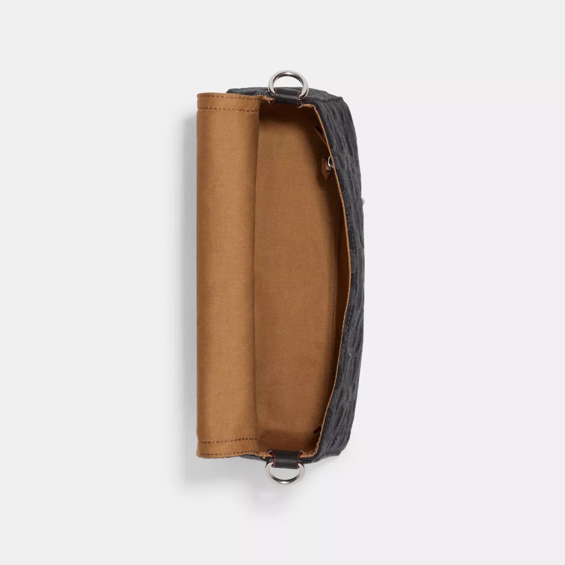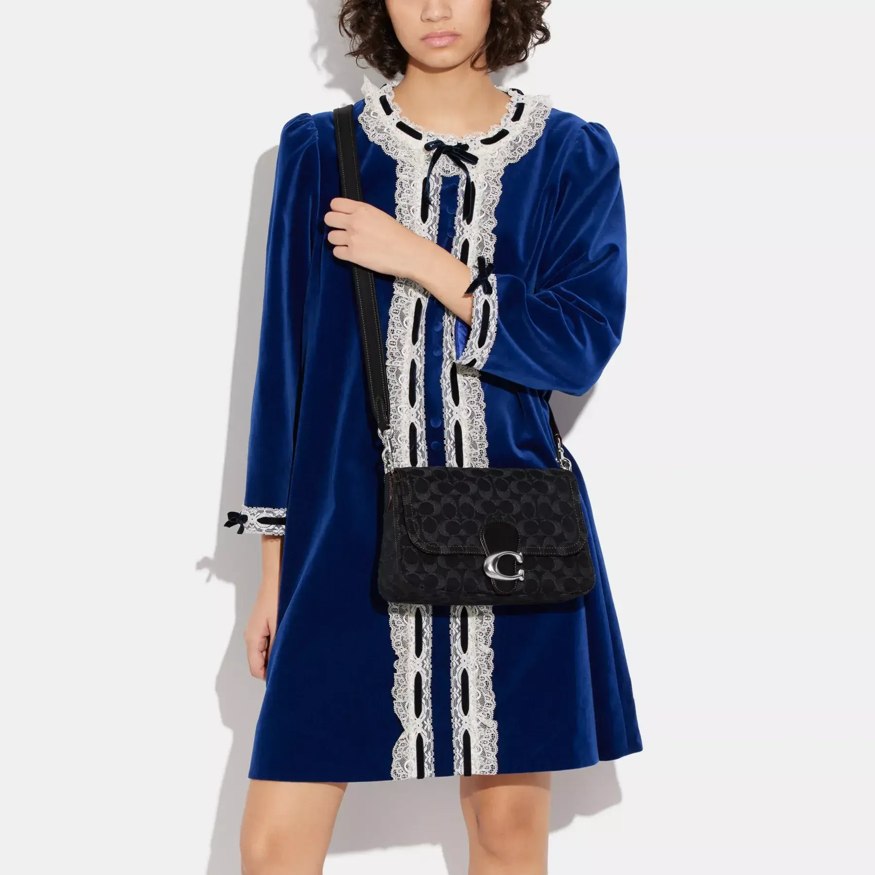 The Soft Tabby reimagines our structured take on an archival 1970s Coach design with a slouchy relaxed feel. Finished with our Signature hardware for an iconic touch, this darkly dramatic black Signature denim and smooth leather shoulder bag features zip pockets inside and out to organize small accessories and two detachable straps to carry by hand, style as a short shoulder bag or wear crossbody.