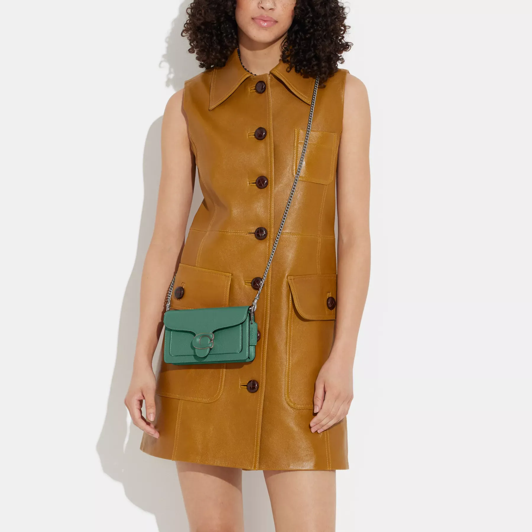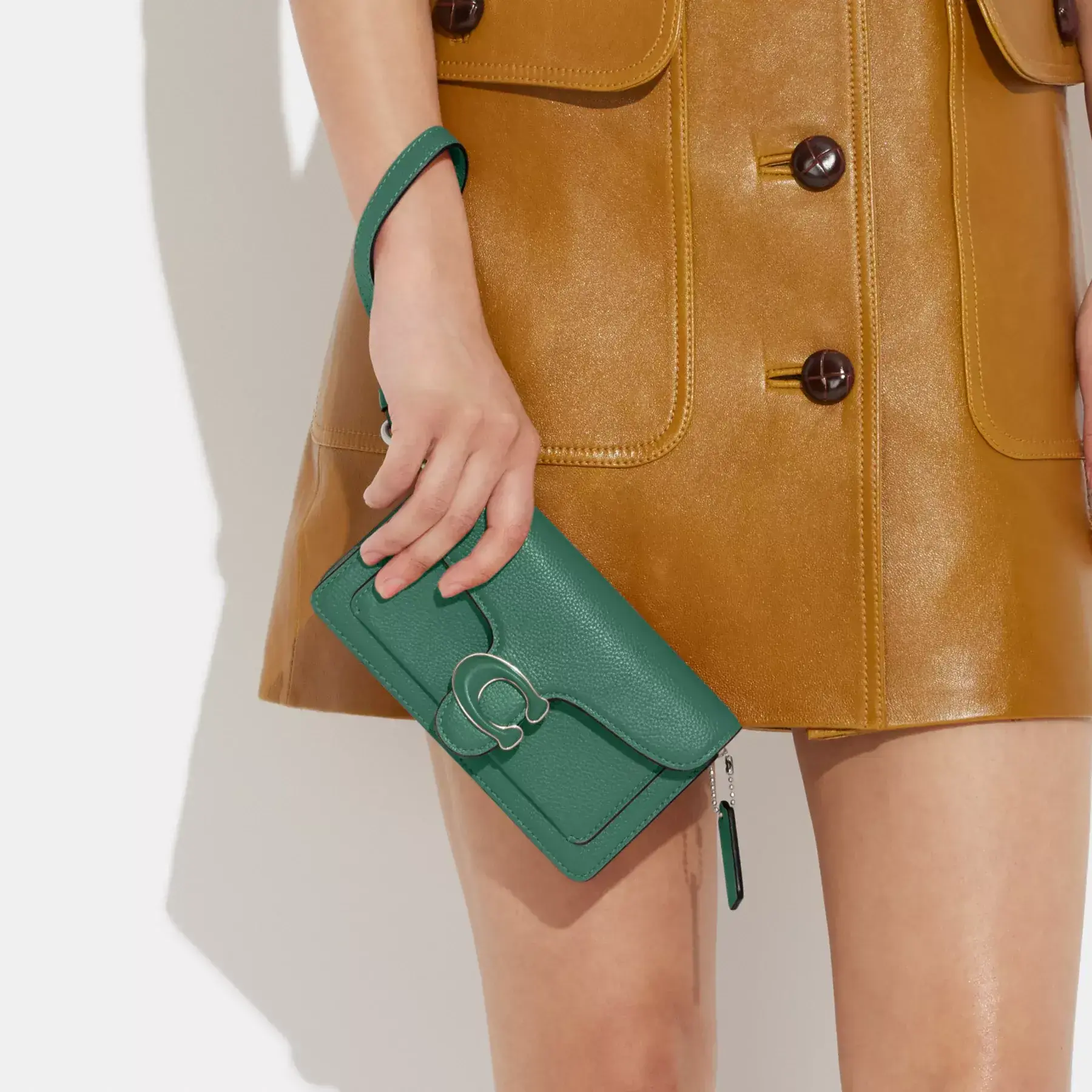A modern take on an archival 1970s Coach design, our structured Tabby wristlet is crafted of polished pebble leather. Finished with our Signature hardware, it’s perfectly sized for cards, cash and a phone with an exterior slip pocket for easy access to essentials. The versatile style can be carried as a wristlet or a clutch and worn crossbody with the elegant chain strap, making it the perfect choice for both dressed up and casual looks.