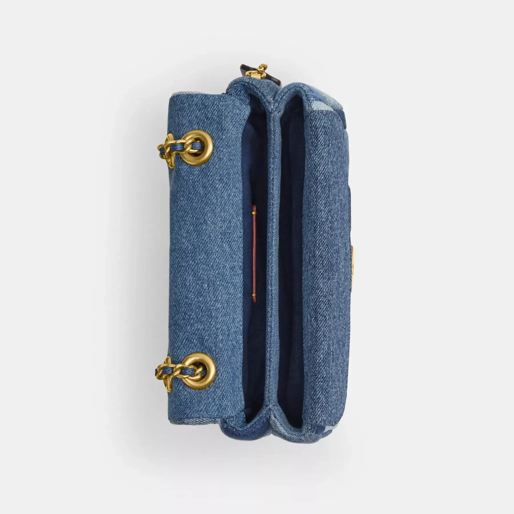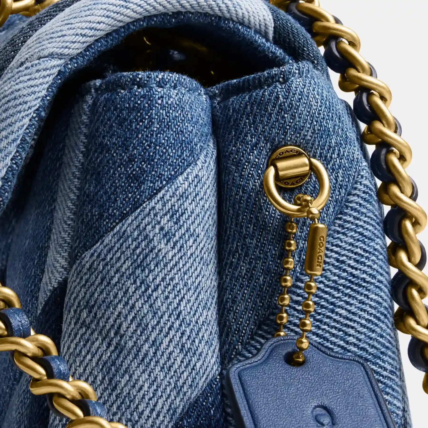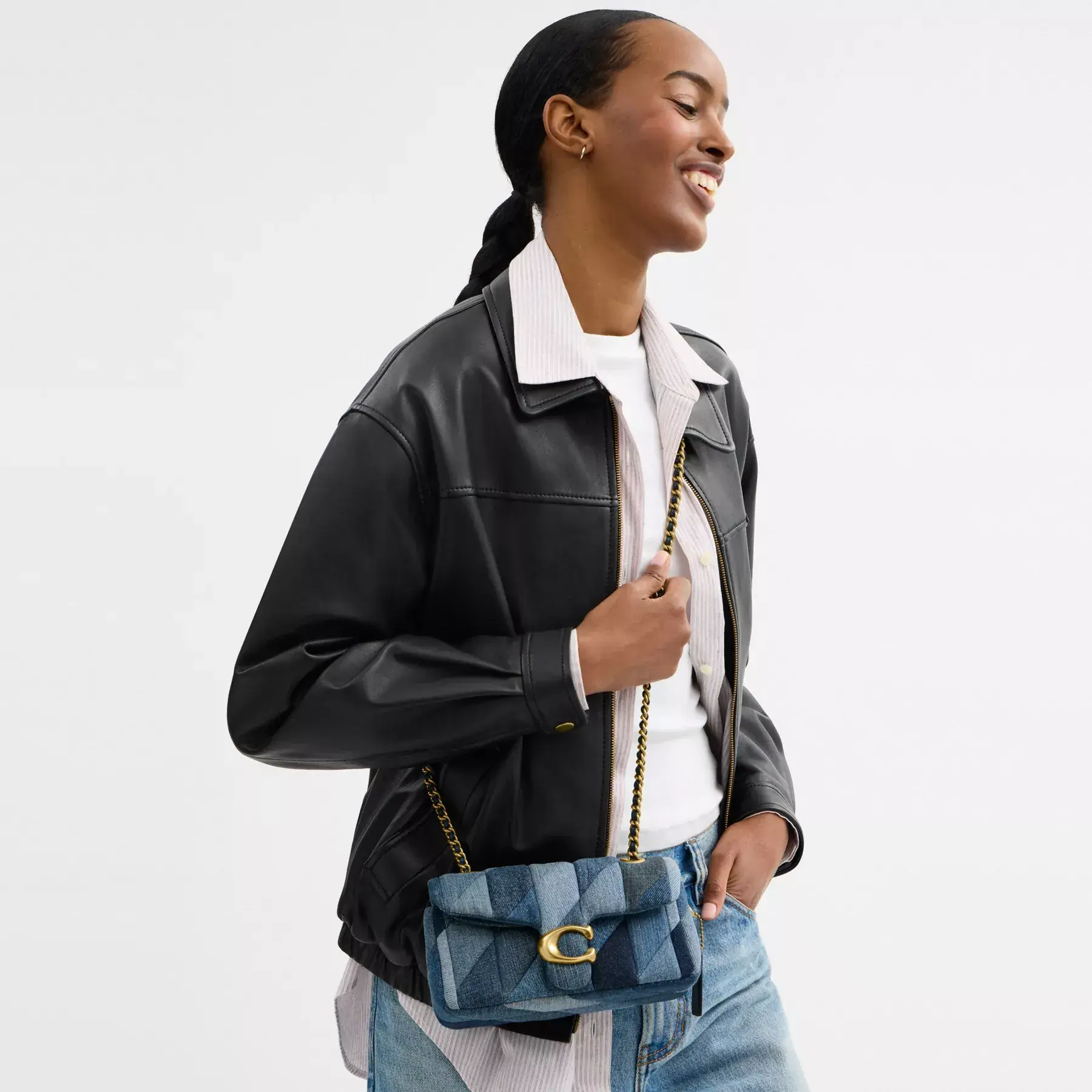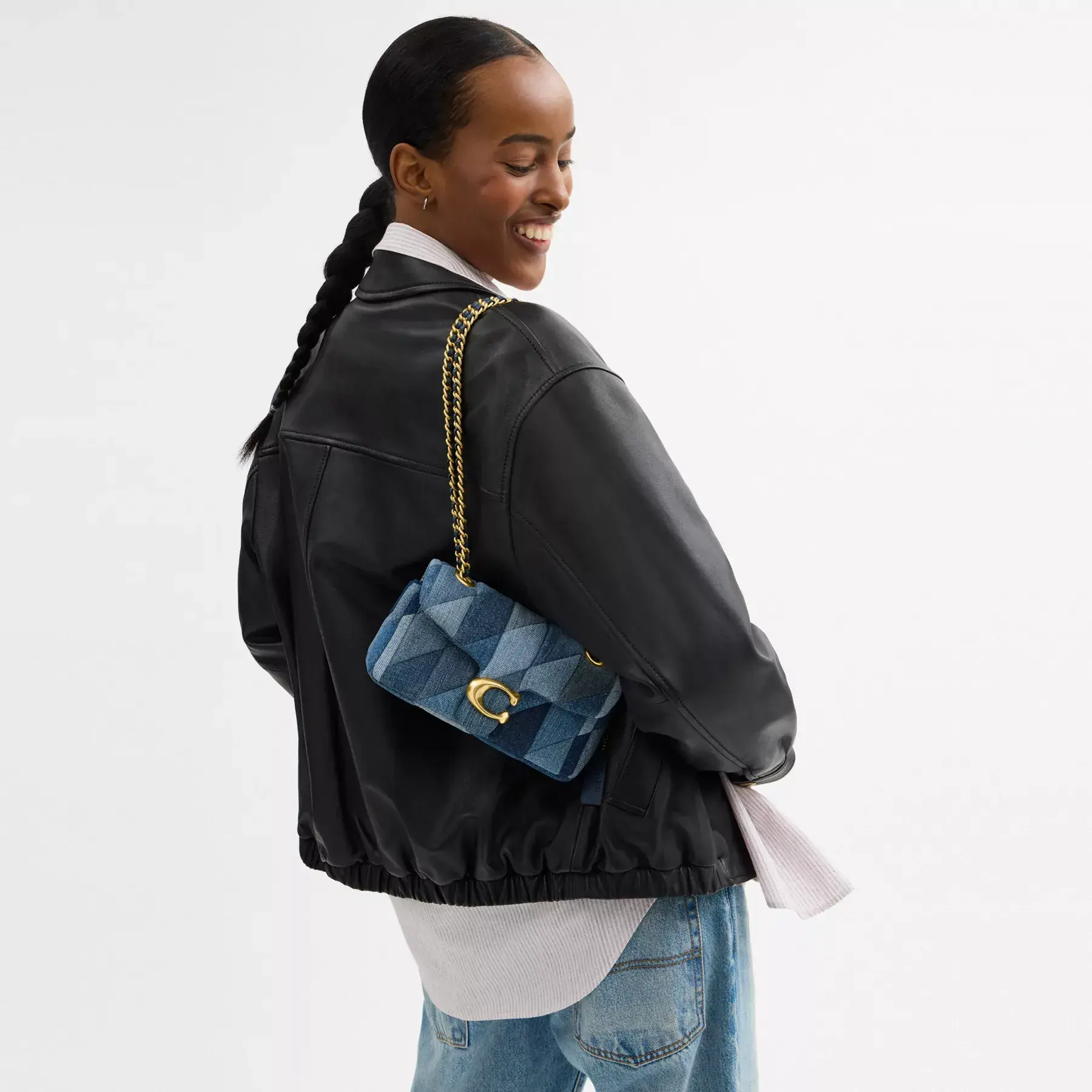 A modern take on an archival 1970s Coach design, our structured Tabby shoulder bag is crafted of a quilted mosaic patchwork of beautifully loveworn repurposed denim inspired by the endless possibilities of secondhand garments and our commitment to reducing our impact on the planet. Smaller than the 26, the petite 20 features a long leather chain strap to wear crossbody or double up for a shorter, dressier look. It’s finished with our Signature hardware for an iconic touch.