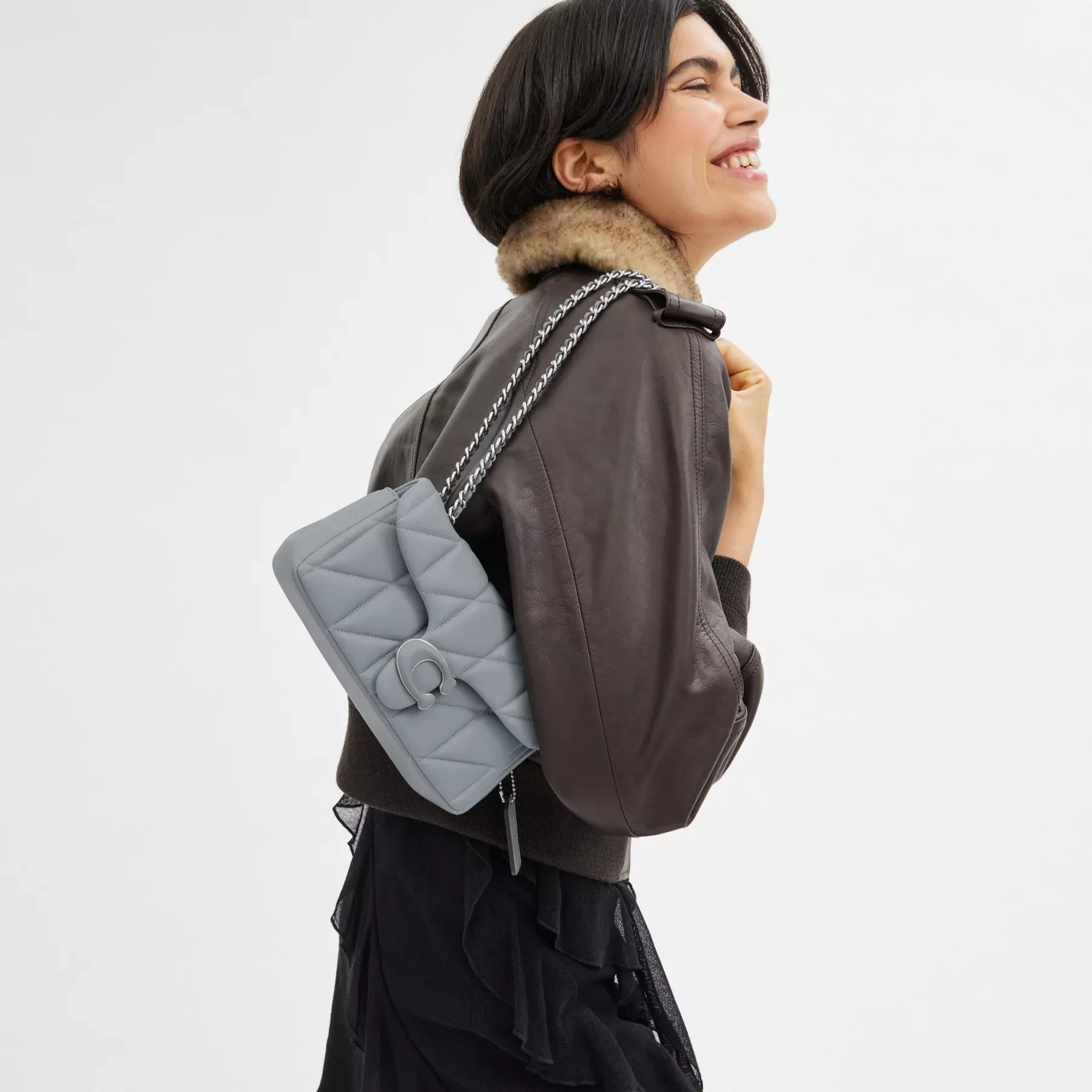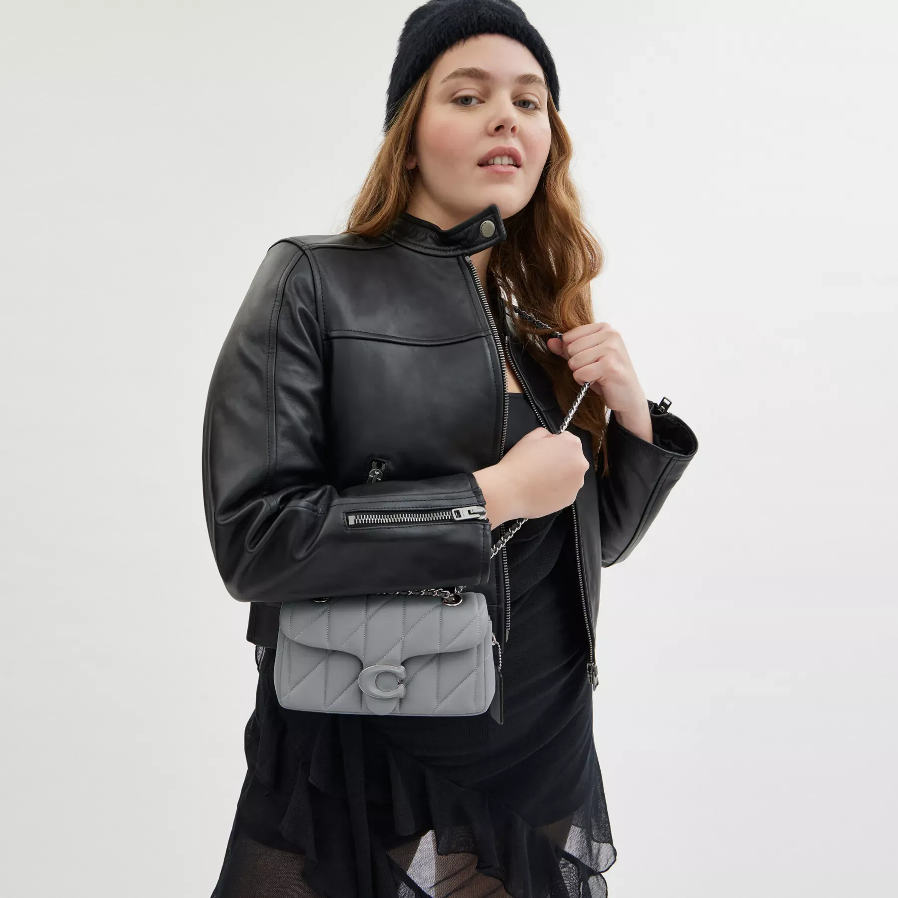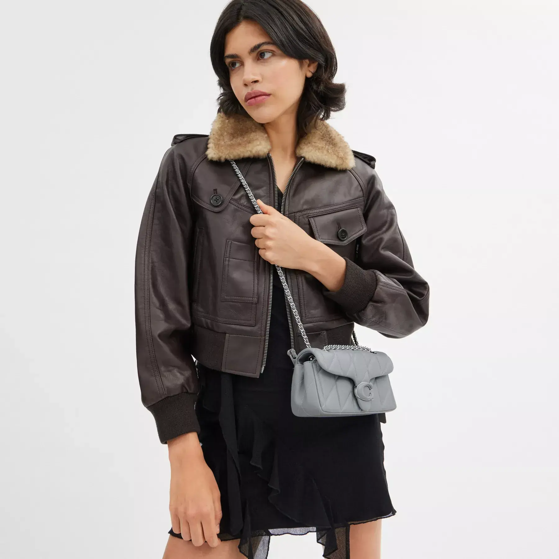 A modern take on an archival 1970s Coach design, our structured Tabby shoulder bag is crafted of quilted plush, ultra-soft nappa leather. Slightly smaller than the 26, the petite 20 features a long leather chain strap to wear crossbody or double up for a shorter, dressier look. It’s finished with our tonal Signature hardware for an iconic touch.