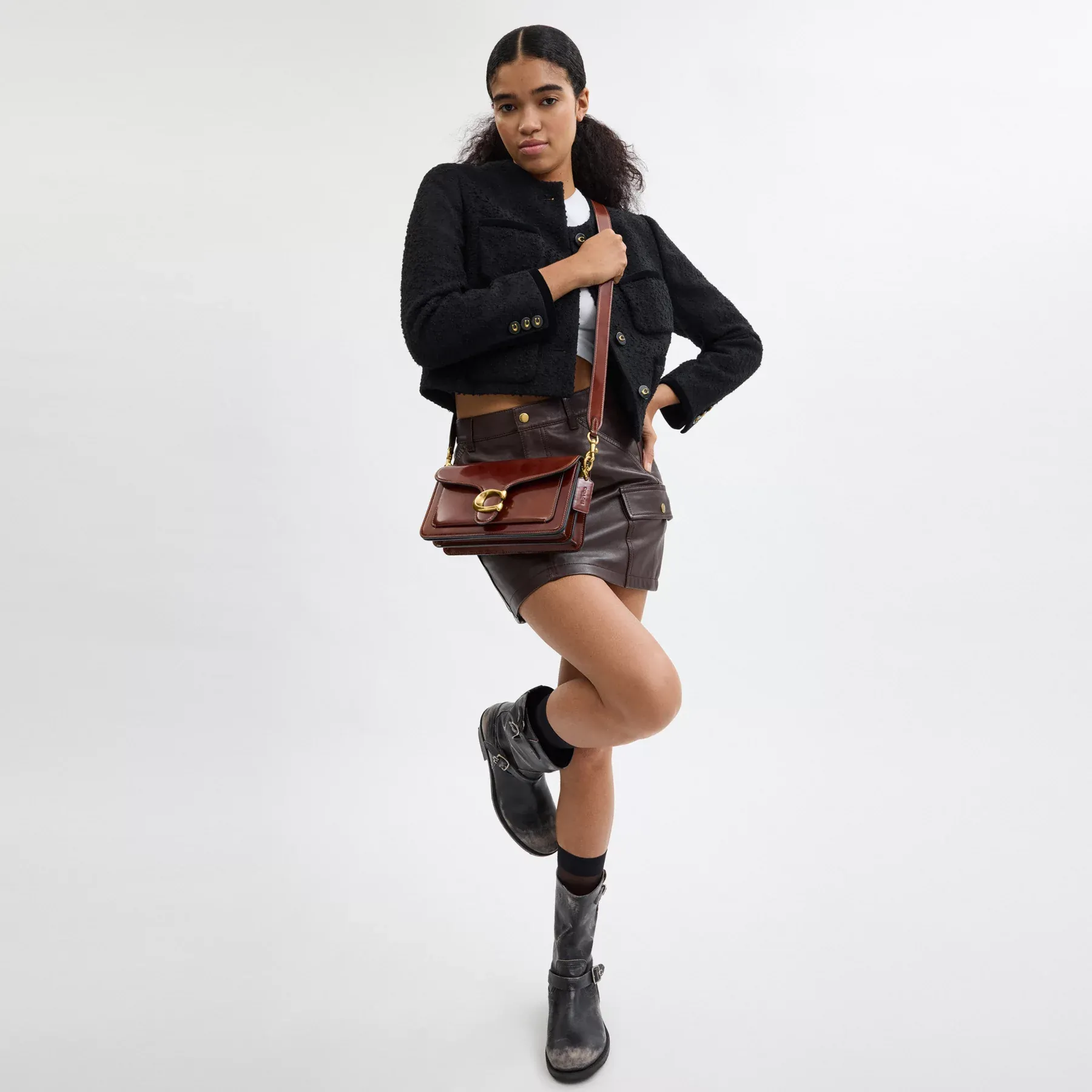 A modern take on an archival 1970s Coach design, our structured Tabby shoulder bag is crafted of lustrous smooth leather. Finished with our tonal leather-covered Signature hardware for an iconic touch, the compact 26 features two detachable straps to carry by hand, style as a short shoulder bag or wear crossbody.