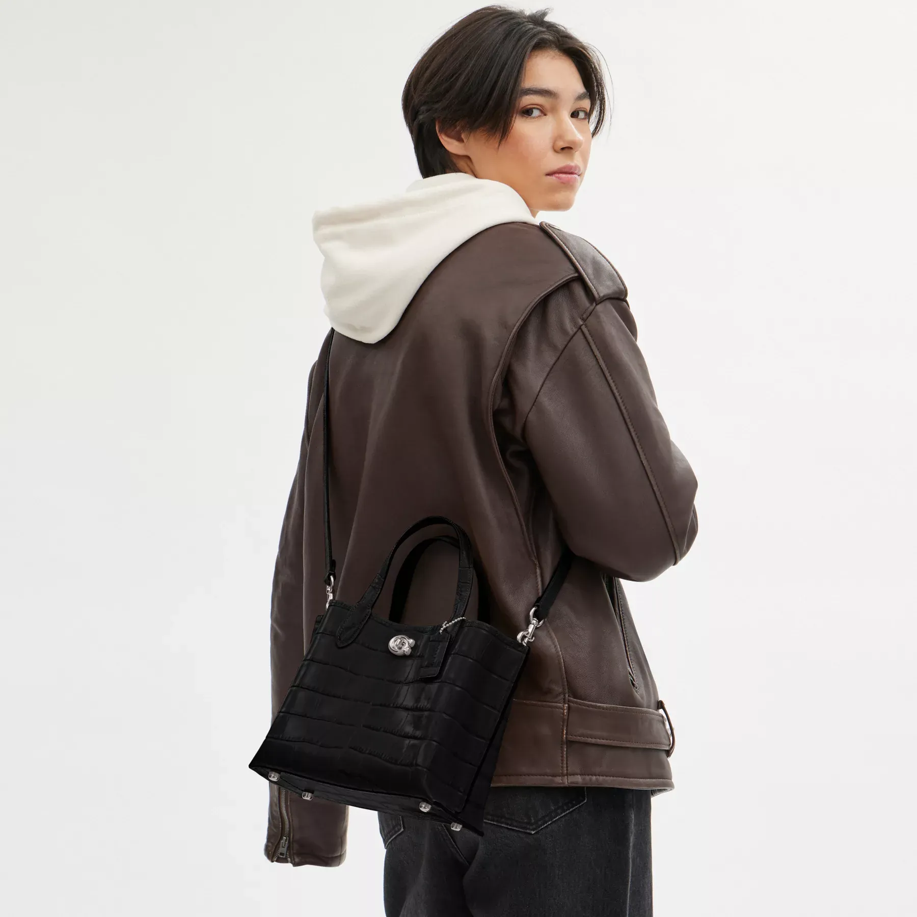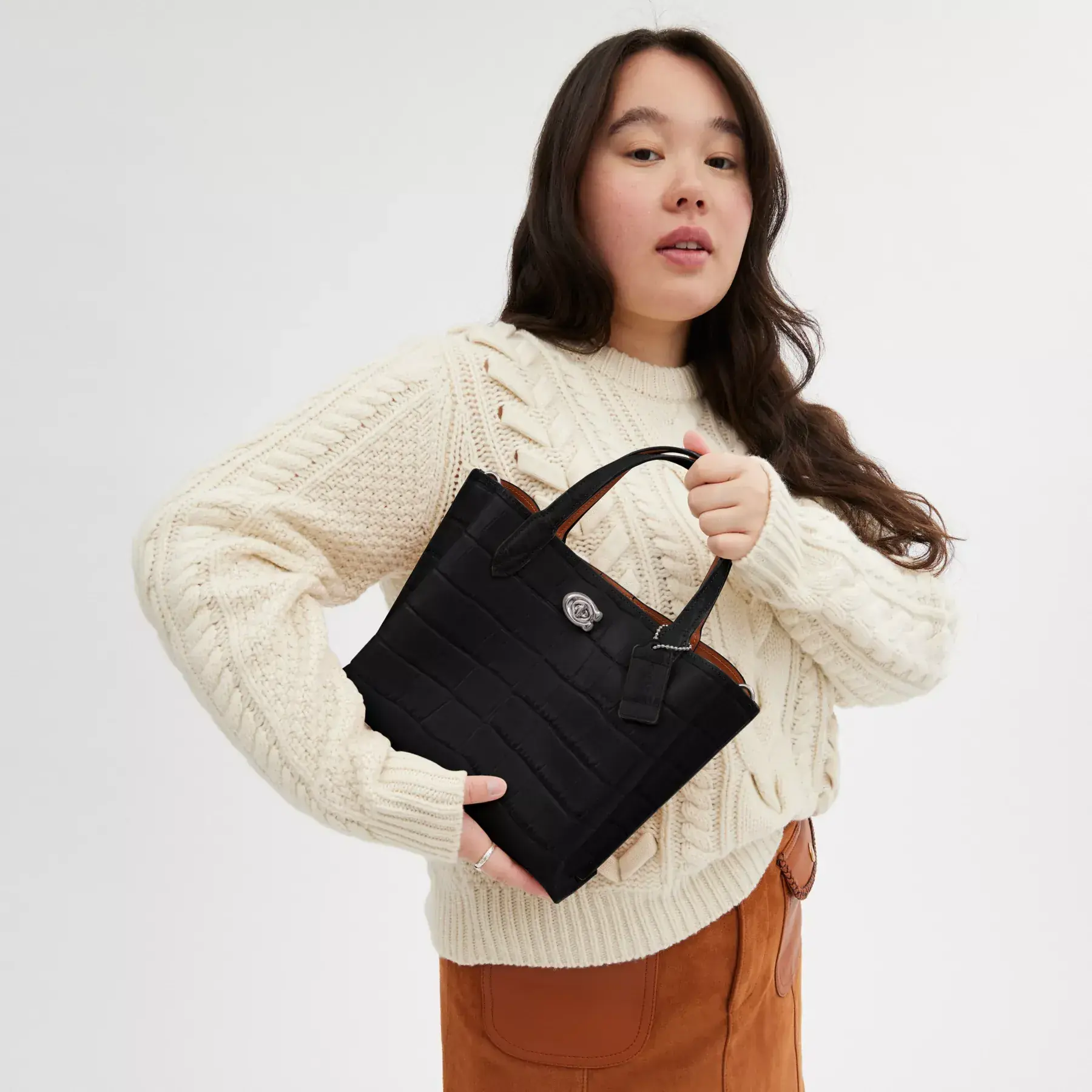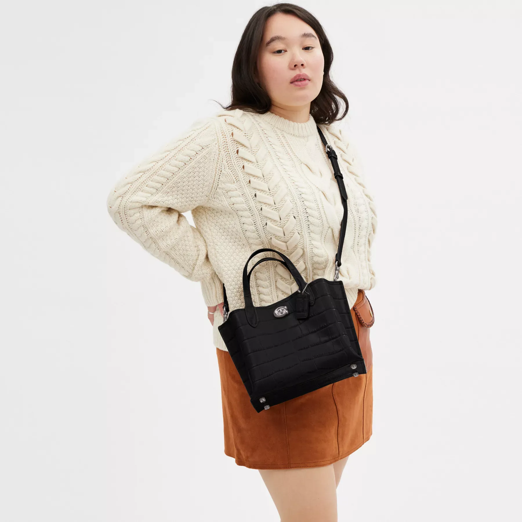 Not too big, not too small, Willow is the perfect carry-it-all tote with space for all of your day-to-day essentials. Crafted of distinctive crocodile-embossed leather and smooth leather, the 24 features two open pockets, a secure center zip compartment and our Signature turnlock closure. Carry it by the top handles or wear on the shoulder and crossbody with the detachable strap.